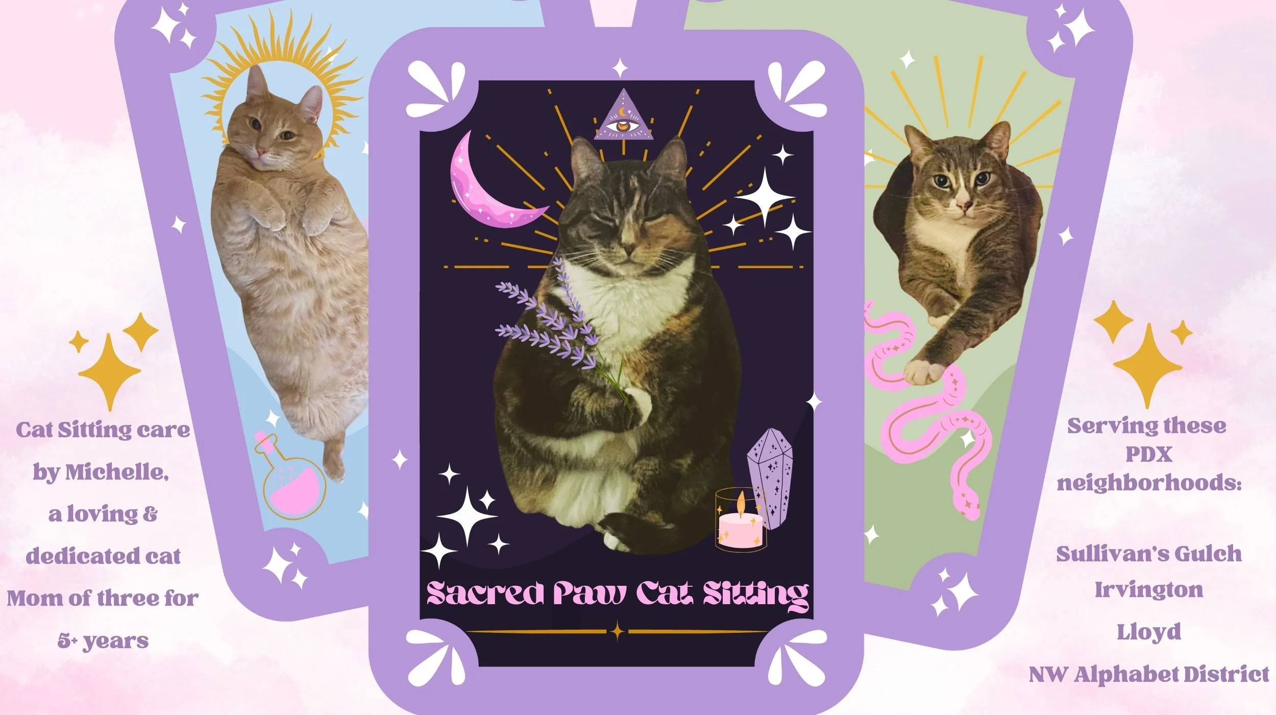 Thank you kindly for choosing Sacred Paw Cat Sitting for your cat’s care while you are away! Please book a free 20-minute consultation before scheduling any 30-minute cat sitting visits to make sure we’re a great fit and I can provide the utmost in care for your cat(s)! I look forward to meeting you and your cat family members!